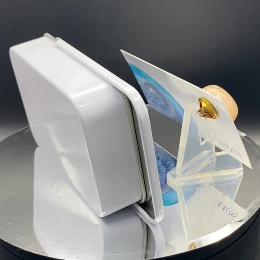 This biotech generates a field with counter clockwise spin and through repeated observation, we've found these wearable works can begin to register with secondary individuals up to 30 feet away. This appears to be a boundary line where depending on free will, some will enter the wearable field and linger, enter the wearable field and exit quickly, or approach the wearable field and change direction to avoid it all together.